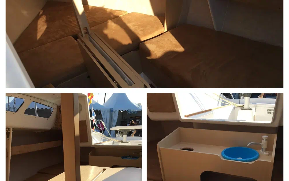 Ses 4 couchettes dotées de coffres de rangements sont organisées autour du puits de dérive équipé d’une astucieuse table rabattable permettant ainsi de déjeuner confortablement. Un bloc cuisine (en option) avec un réchaud et une réserve d’eau complétera l’équipement nécessaire à la croisière.