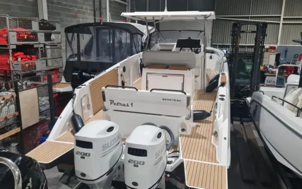 Ce Flyer 9 Sundeck est motorisé avec deux puissants moteurs **Suzuki DF200** essence, ayant seulement **123 heures** d’utilisation, pour une navigation en toute sérénité.