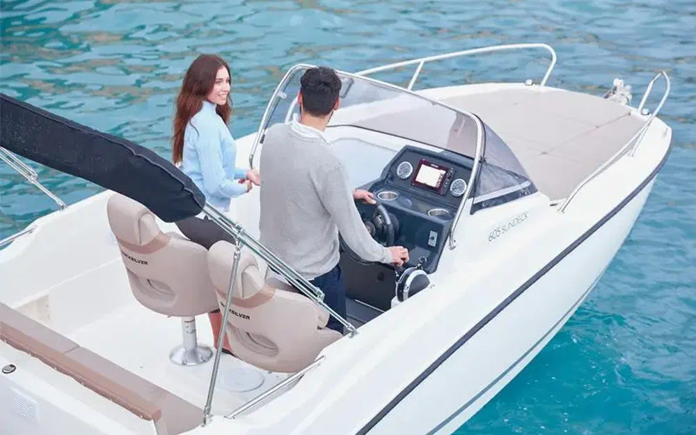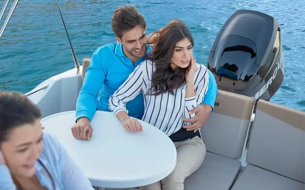 lors d’une escapade romantique. Son moteur Mercury garantit une navigation sécurisée en journée.